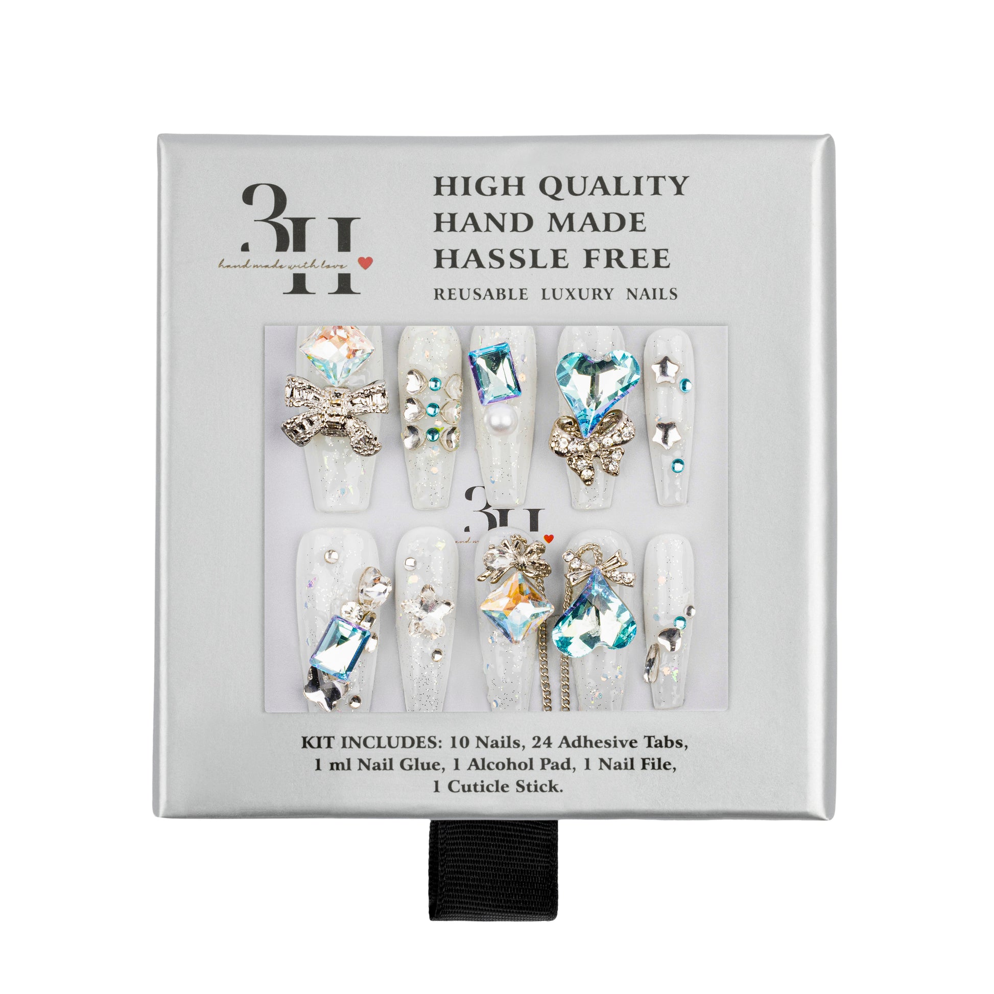 INCLUDES: 10 nails | 1 alcohol pad | 24 adhesive tabs | 1 ml nail glue | 1 cuticle stick | 1 nail file