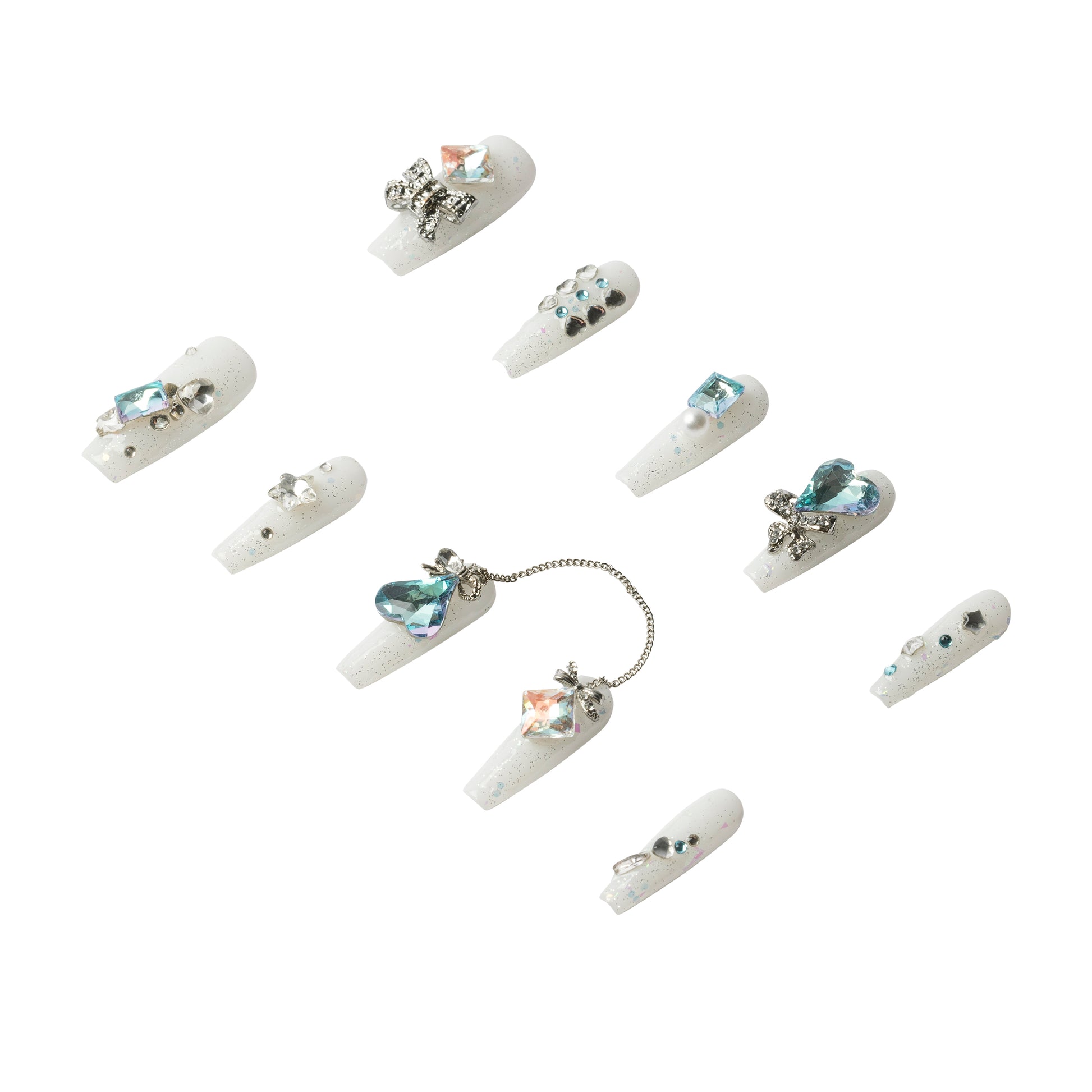 Clear press-on nails with icy blue accents, sparkling rhinestones, and bold crystal charms. Includes everything you need for a flawless, reusable salon look at home.