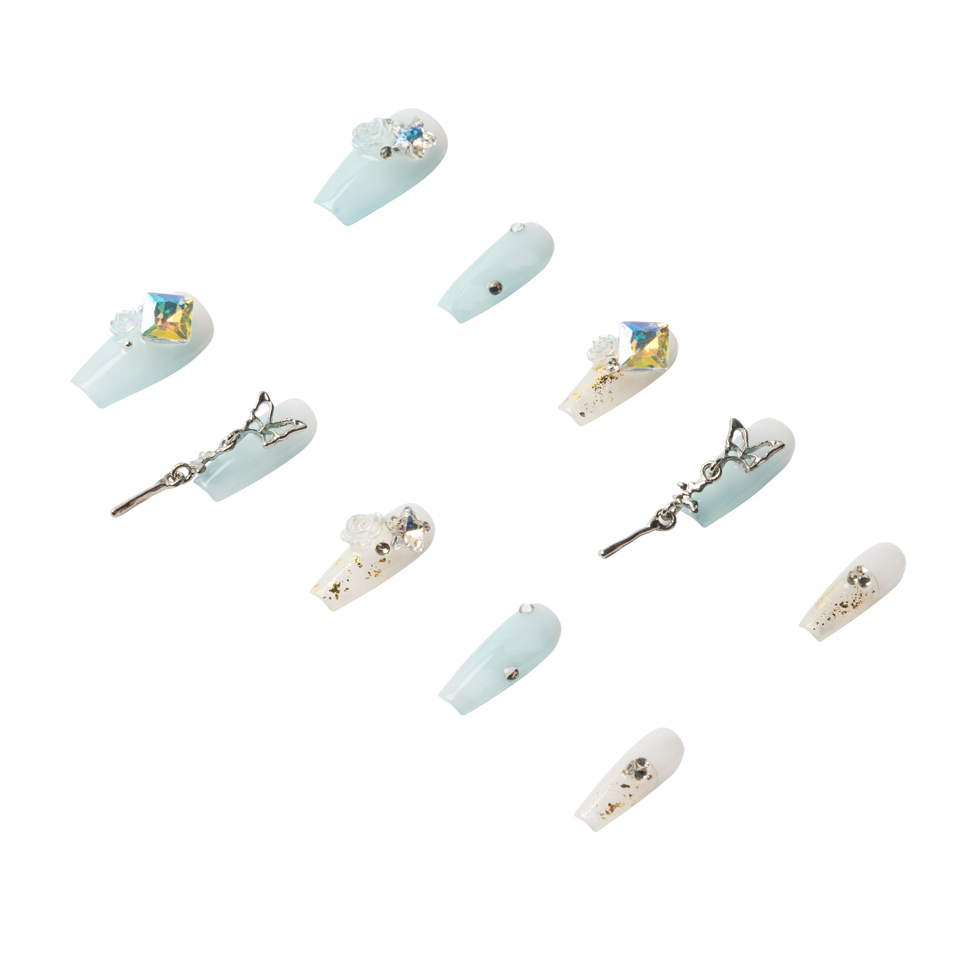 Elegant blue and white press-on nails with shimmering gold flakes, sparkling rhinestones, and delicate silver butterfly charms. Reusable, easy to apply, and perfect for adding a frosty, glamorous touch to any look.