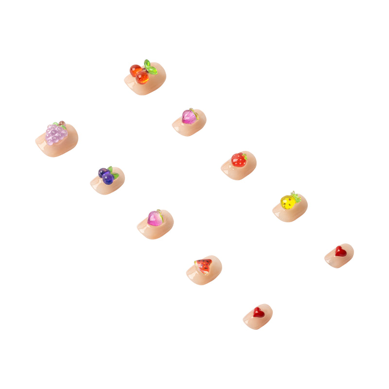 So snackable-this handmade short square press-on nail set features a natural beige base with playful 3D fruit charms at the center of each nail. From cherries and grapes to watermelon and strawberries, plus a pop of heart charms, these nails are cute, chic, and full of personality.