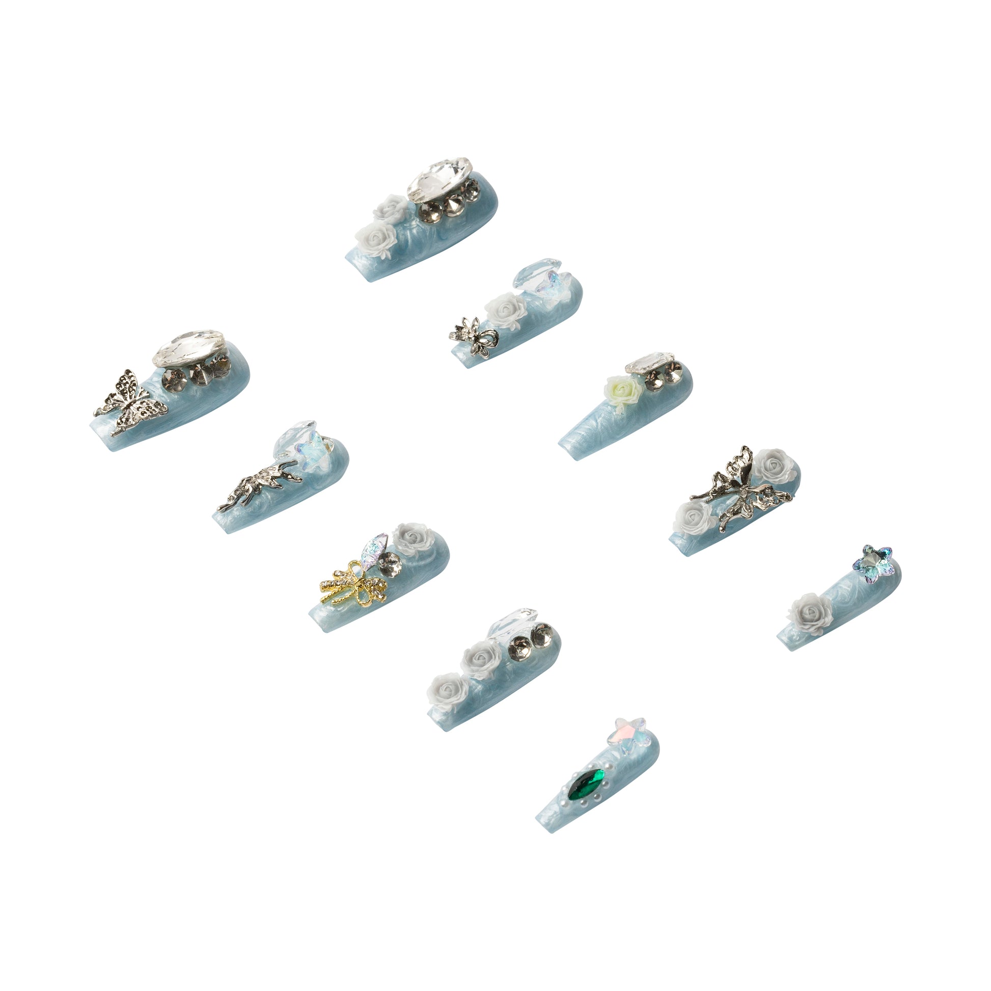 Make a statement with these icy blue coffin-shaped nails, adorned with delicate roses, butterflies, and sparkling crystal charms. Handmade from premium materials and fully reusable, this glamorous set delivers an elegant, eye-catching finish that’s perfect for any occasion.