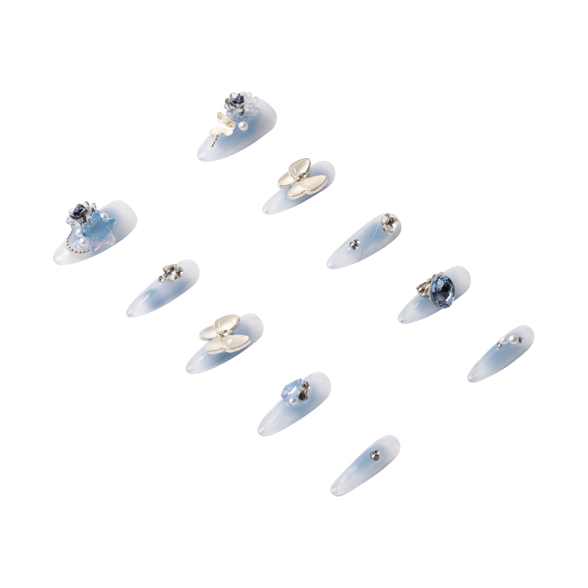 These almond-shaped nails in a dreamy blue hue are adorned with delicate butterfly and rose charms, accented by luminous pearls and sparkling gems. Handmade with care from premium materials, this reusable set delivers salon-level elegance and an ethereal touch-perfect for elevating any look.