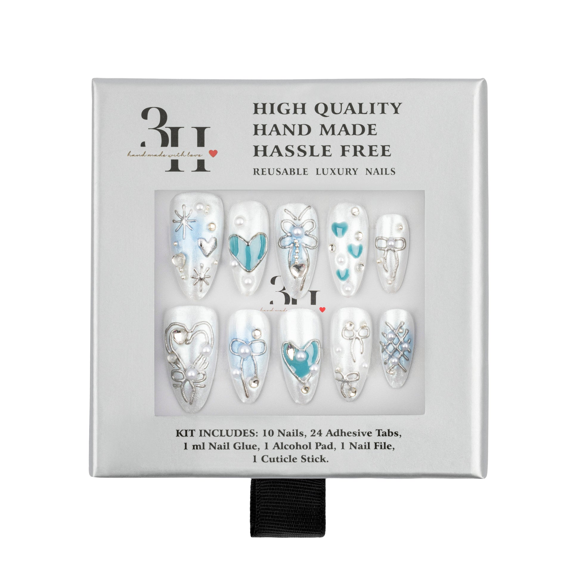 INCLUDES: 10 nails | 1 alcohol pad | 24 adhesive tabs | 1 ml nail glue | 1 cuticle stick | 1 nail file