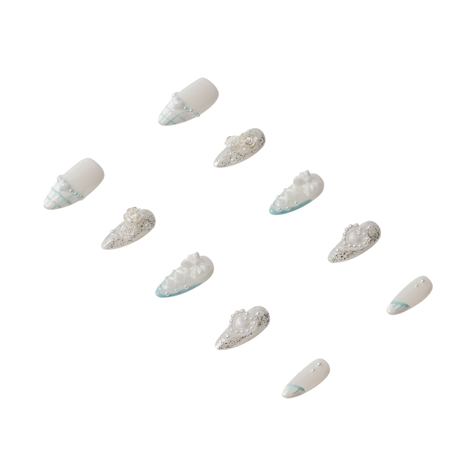 Add a touch of charm with these handmade almond nails, featuring delicate pearls and adorable bow, heart, and floral charms. Reusable and thoughtfully crafted—they're perfect for a special night out or everyday wear.