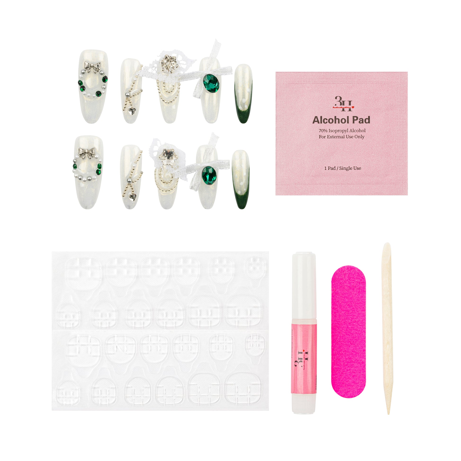 INCLUDES: 10 nails | 1 alcohol pad | 24 adhesive tabs | 1 ml nail glue | 1 cuticle stick | 1 nail file