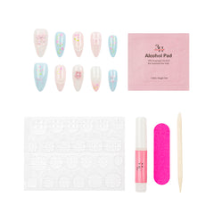 First Date is a long almond press-on nail set blending pastel pink and blue tones for a soft, playful look. Delicate flower and bow motifs are paired with fine white line detailing, creating a dainty, innocent aesthetic that feels effortlessly put together.