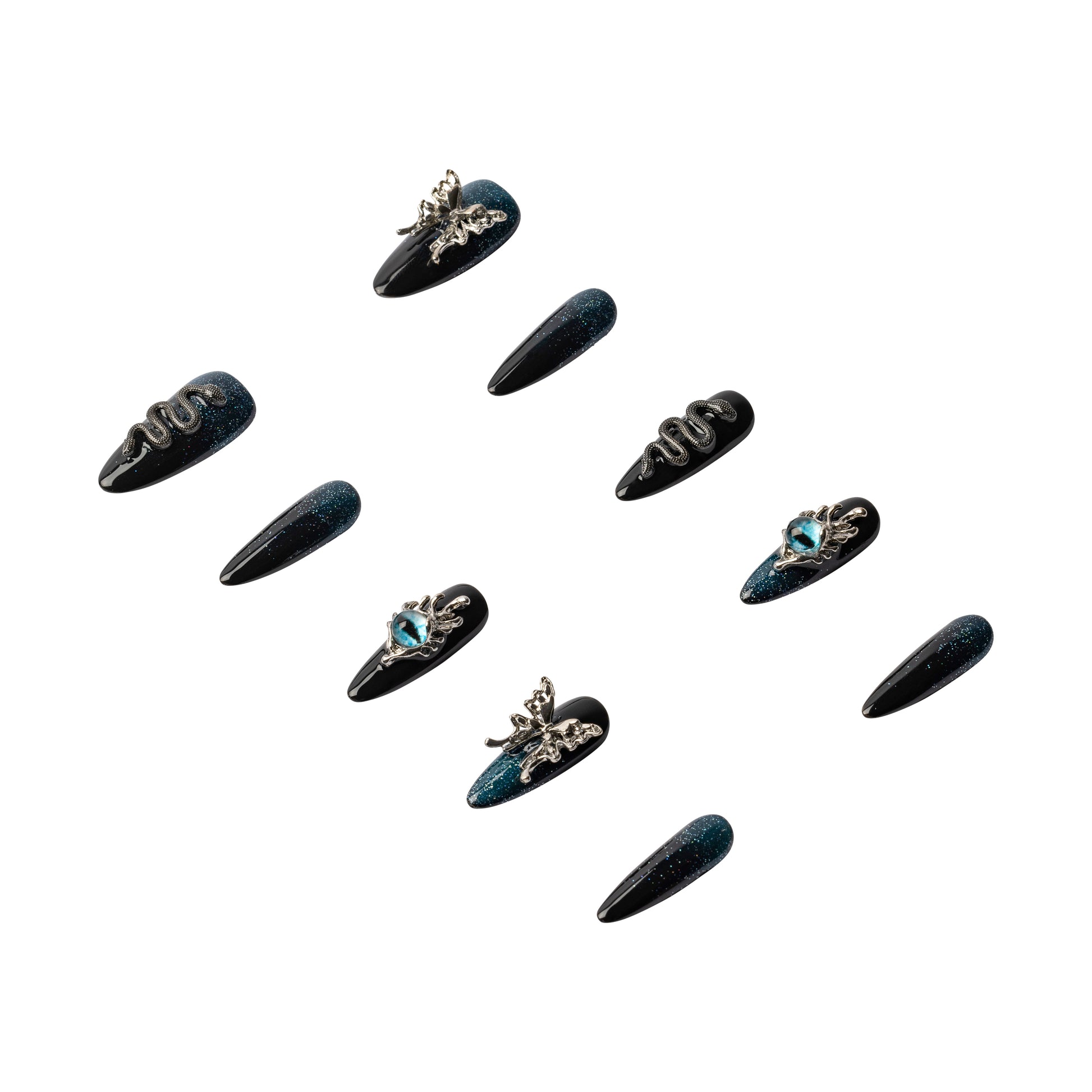 Turn heads with these almond-shaped nails fading from midnight black into a dreamy teal They're dressed with silver butterfly wings, hypnotic eyes, and a sleek black snake charm for an edgy, yet elegant style. Handmade and reusable, this fantasy-inspired set blends mystery with enchanting details for a magical look.