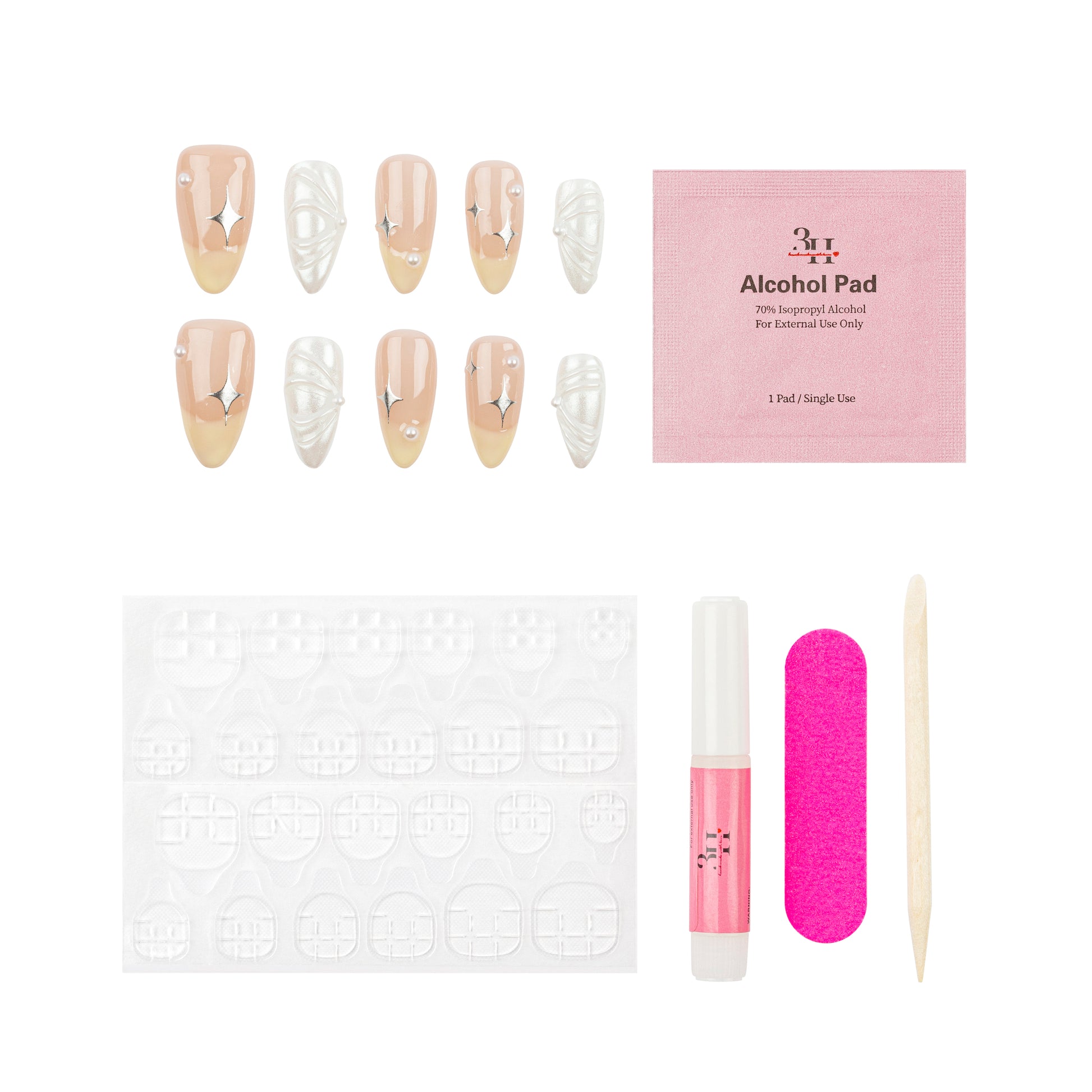 INCLUDES: 10 nails | 1 alcohol pad | 24 adhesive tabs | 1 ml nail glue | 1 cuticle stick | 1 nail file