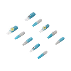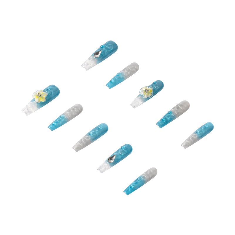 Teal coffin nails with a water-textured ombré effect and a tropical flower charm create a serene, playful, and vibrant look. Handmade and reusable, this set captures the lively beauty of the tropics with an effortlessly polished finish.