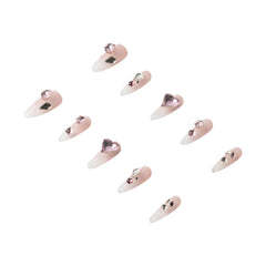 Feel like your own fairytale with our Princess Aura set. Its almond-shape blends soft pink tones in a dreamy ombre, like the first light of dawn. Sparkling pink heart gems and clear crystals add delicate highlights, letting your nails tell a story of elegance, charm, and loveliness with every gesture.