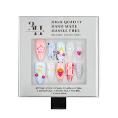 INCLUDES: 10 handmade press-on nails | 1 alcohol pad | 24 adhesive tabs | 1 ml nail glue | 1 cuticle stick | 1 nail file