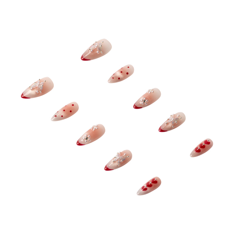 These medium almond press-on nails feature red polka dots, tips, 3D pearly accents, and a shimmering ombré finish-they’re the perfect mix of soft and bold. Tiny butterflies and hearts add the sweetest touch, making every glance at your hands a mini love story. Handmade, reusable, and high-quality for effortless, polished charm.
