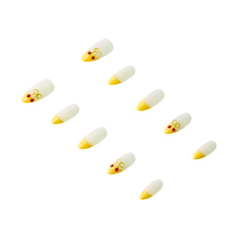 Cherry Pop is a medium almond press-on nail set in butter yellow French tips, hand-painted with red cherry bow motifs and a touch of shimmer. Handmade and reusable, this playful set gives you instant pop-and-play energy for your hands.