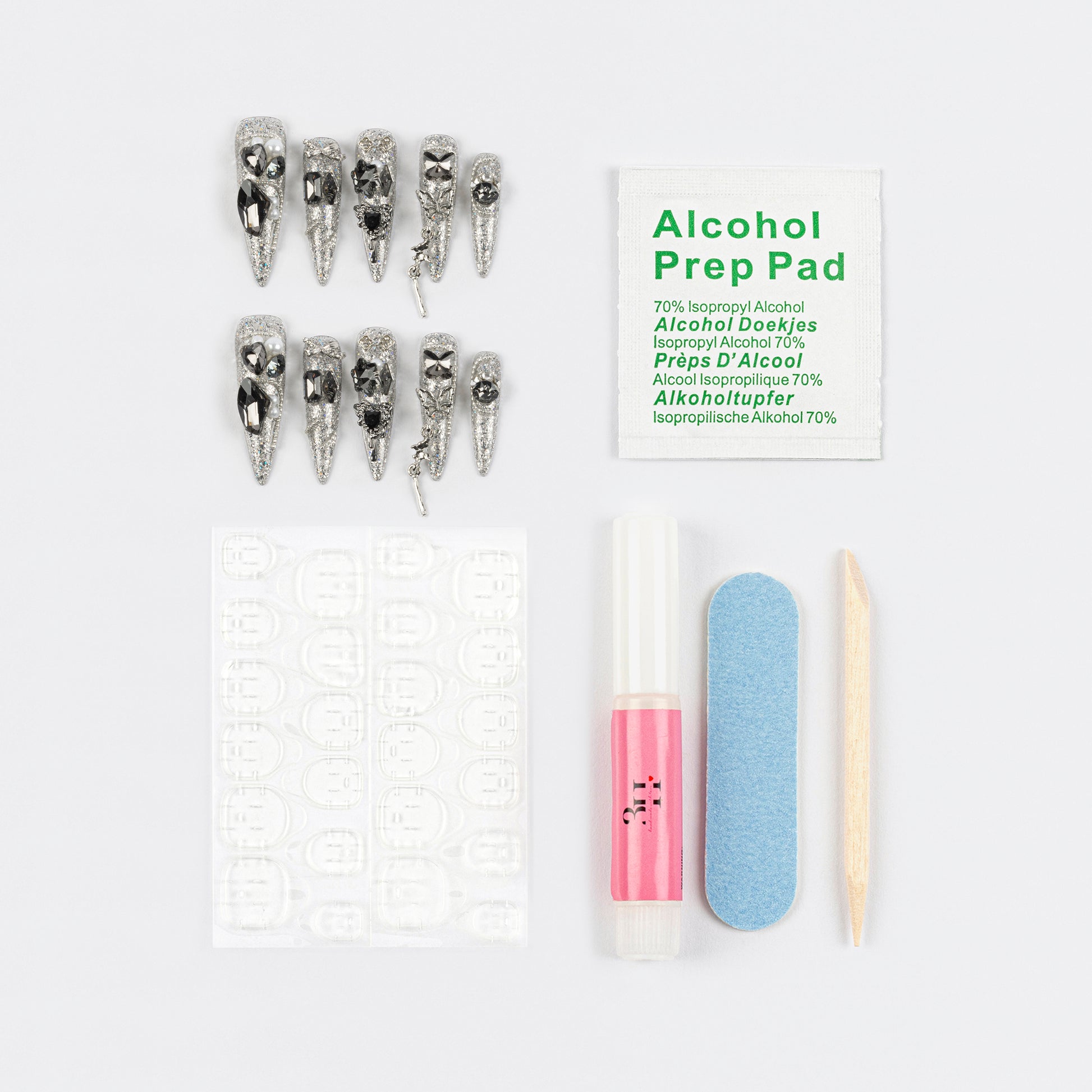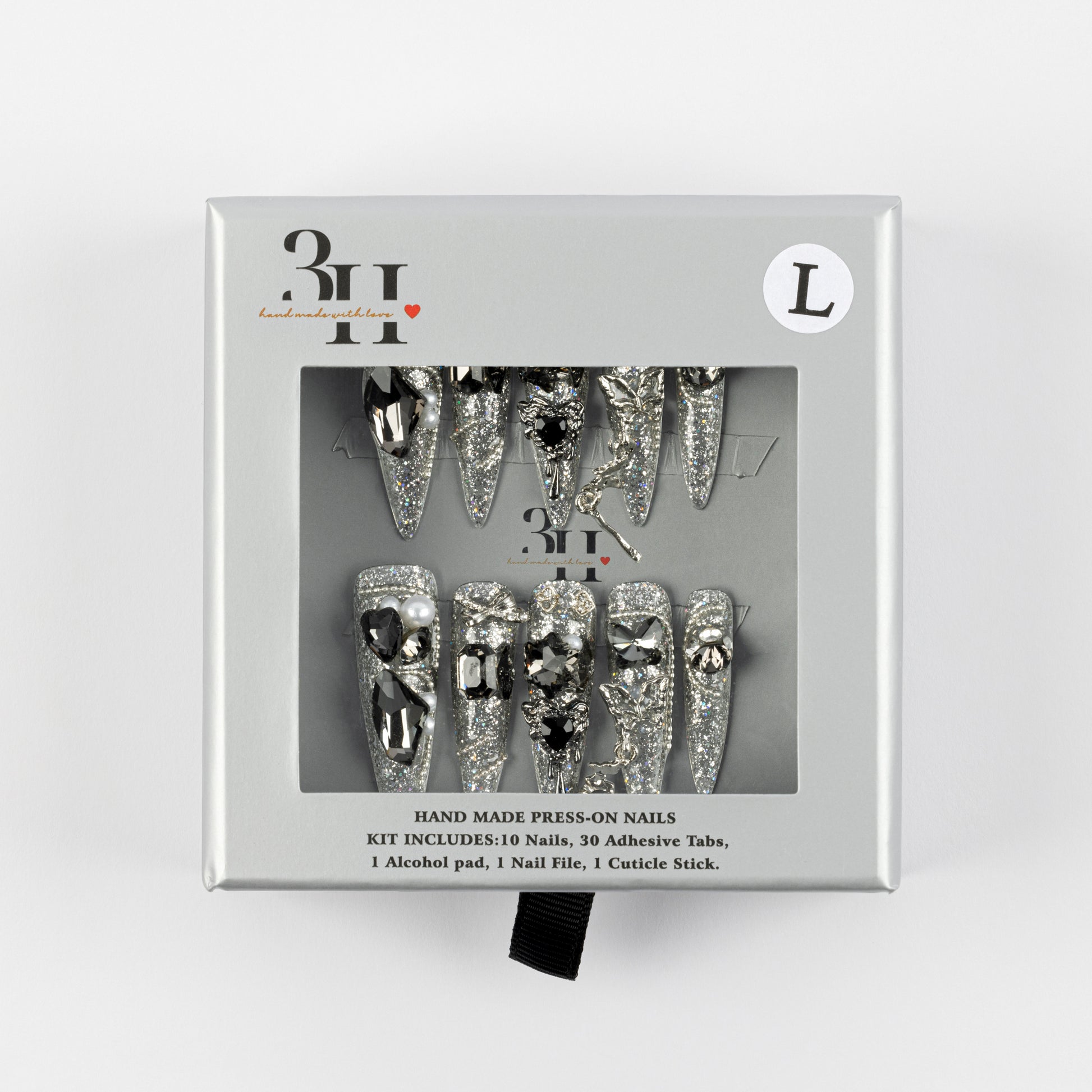 Chrome Dagger is a bold, handcrafted press-on nail set with sharp stiletto tips, silver glitter, and edgy black gem accents. Designed to slay—this metallic masterpiece is made for statement looks.