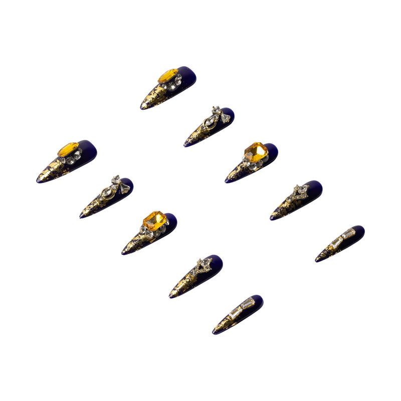 Empire Gold features long stiletto press-on nails in deep navy blue with bold gold gems, chunky 3D charms, and shimmering gold accents. This handmade, reusable set blends regal color with statement sparkle for a powerful, elevated look.