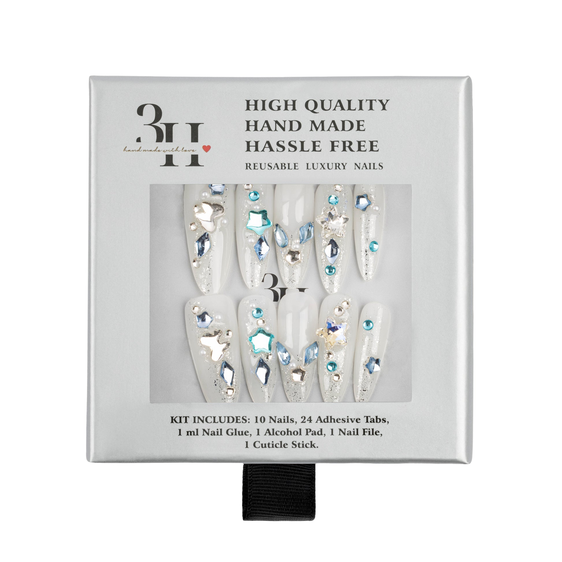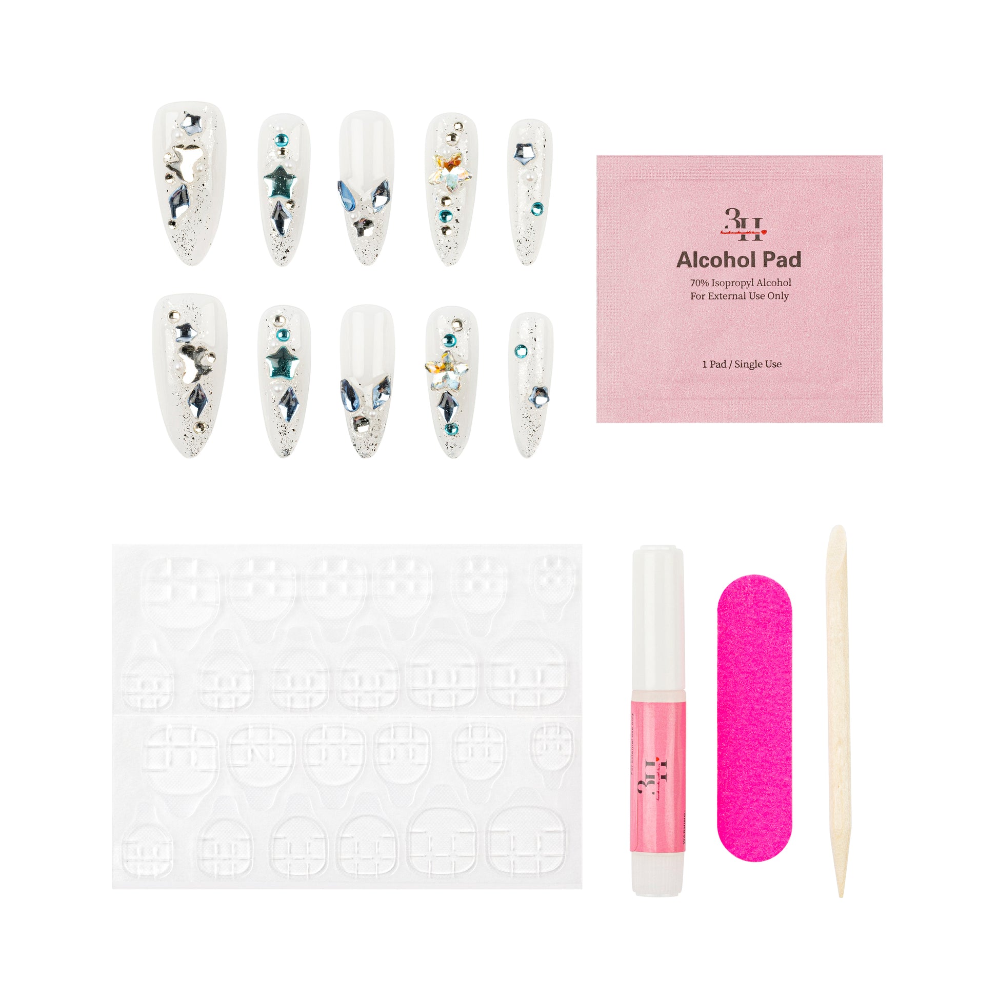 INCLUDES: 10 nails | 1 alcohol pad | 24 adhesive tabs | 1 ml nail glue | 1 cuticle stick | 1 nail file