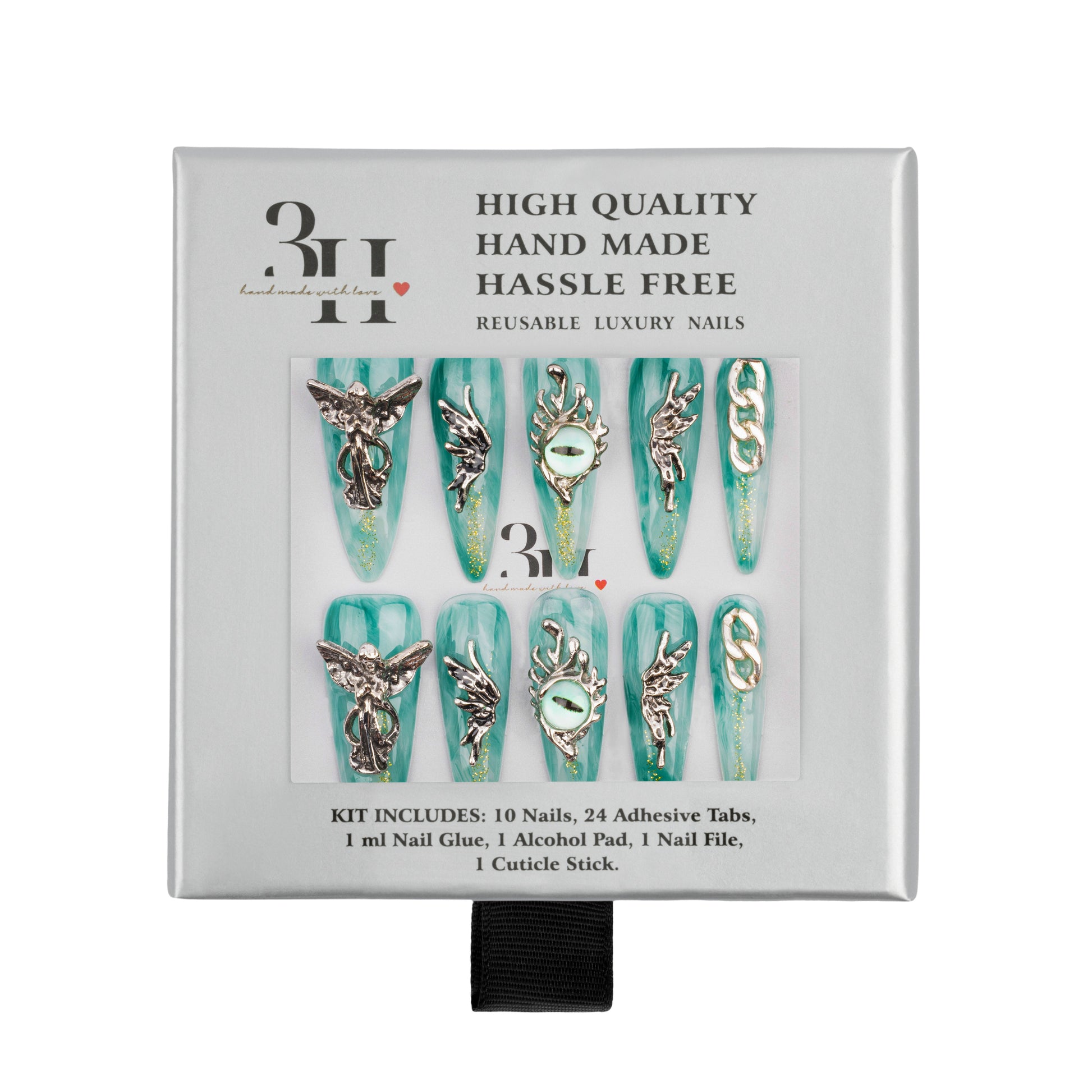 Add a touch of magic with these handmade, reusable stiletto nails, featuring a marbled green base adorned with silver fantasy motifs-fairy wings, chain details, and dragon eye charms. This set combines fantasy and edge for a look that's both enchanting and daring.