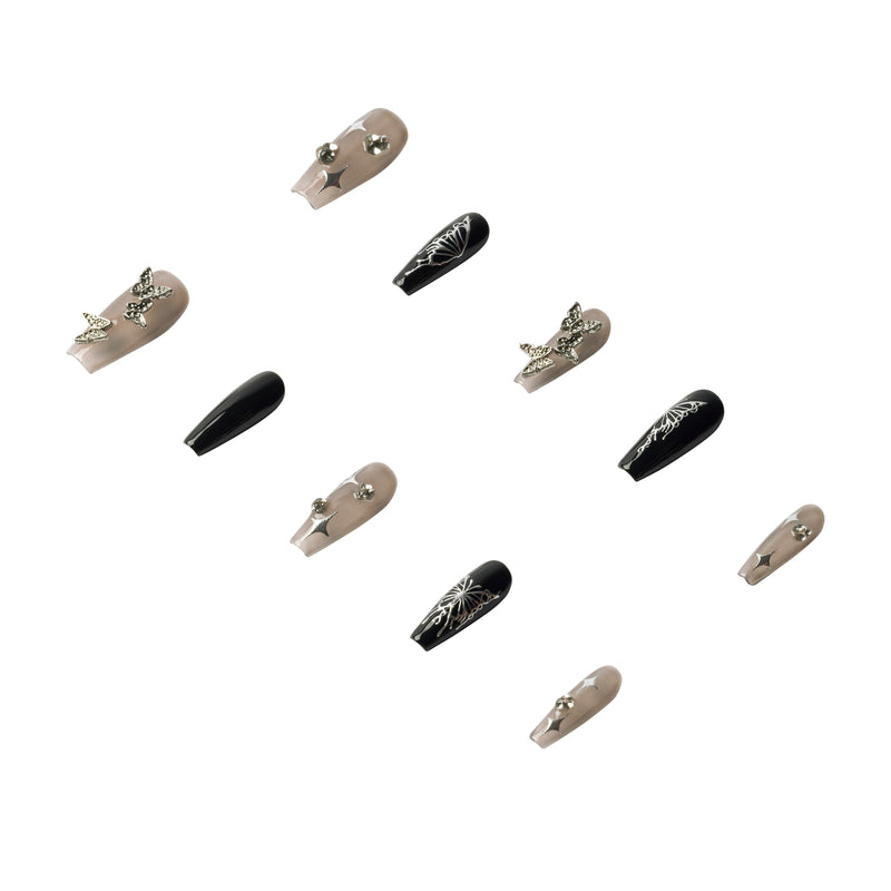 Unveil a touch of the mystical with this set, adorned with elegant silver butterfly wings against a contrasting nude and black palette.