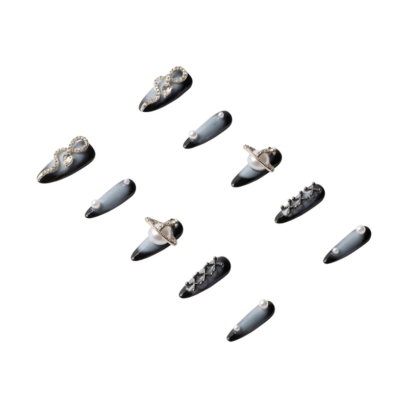Sapphire Cascade features long almond press-on nails in black and smoky blue with pearls, lace-up details, and sparkling jeweled snake charma. Handmade and reusable, this set is perfect for anyone who loves nails with an edge.