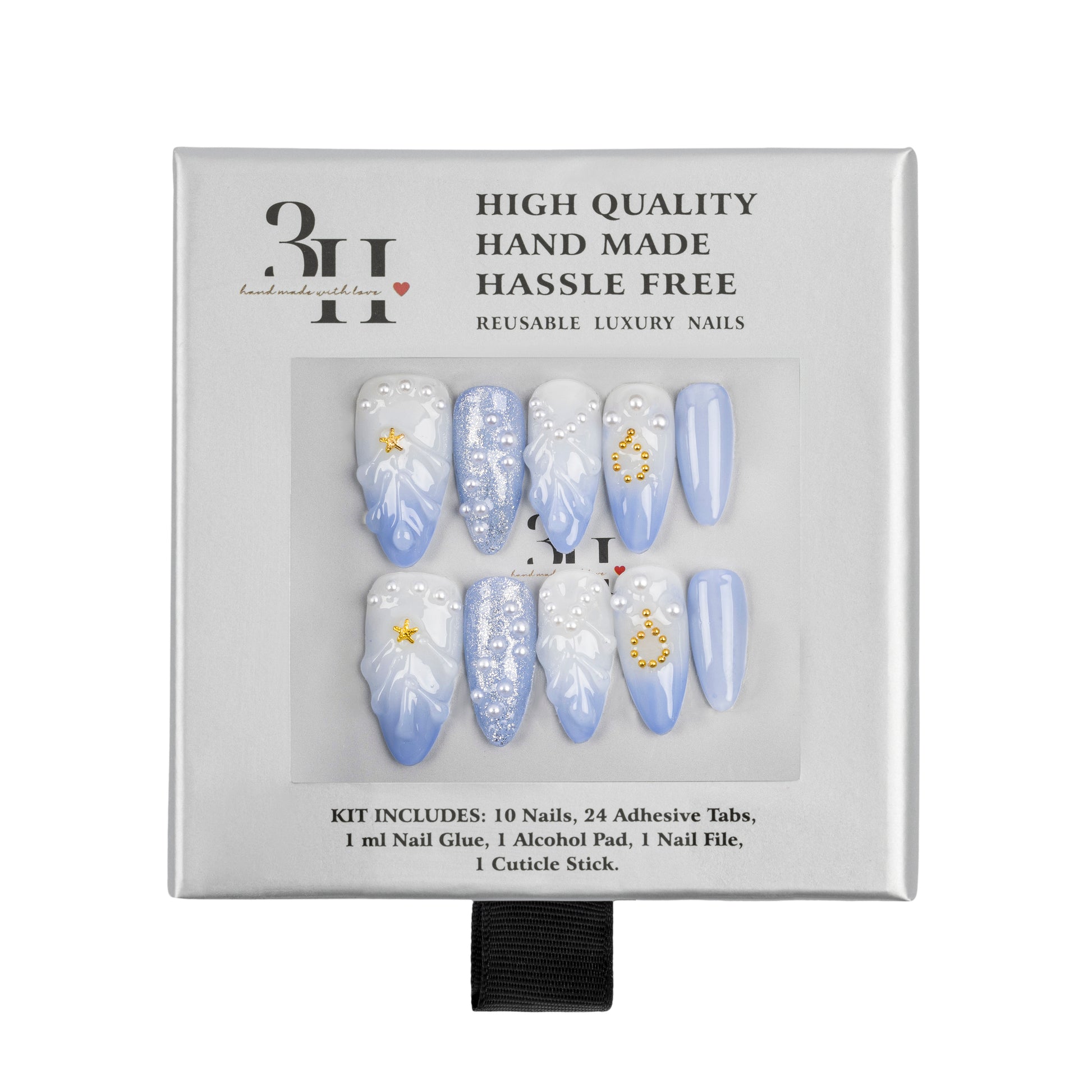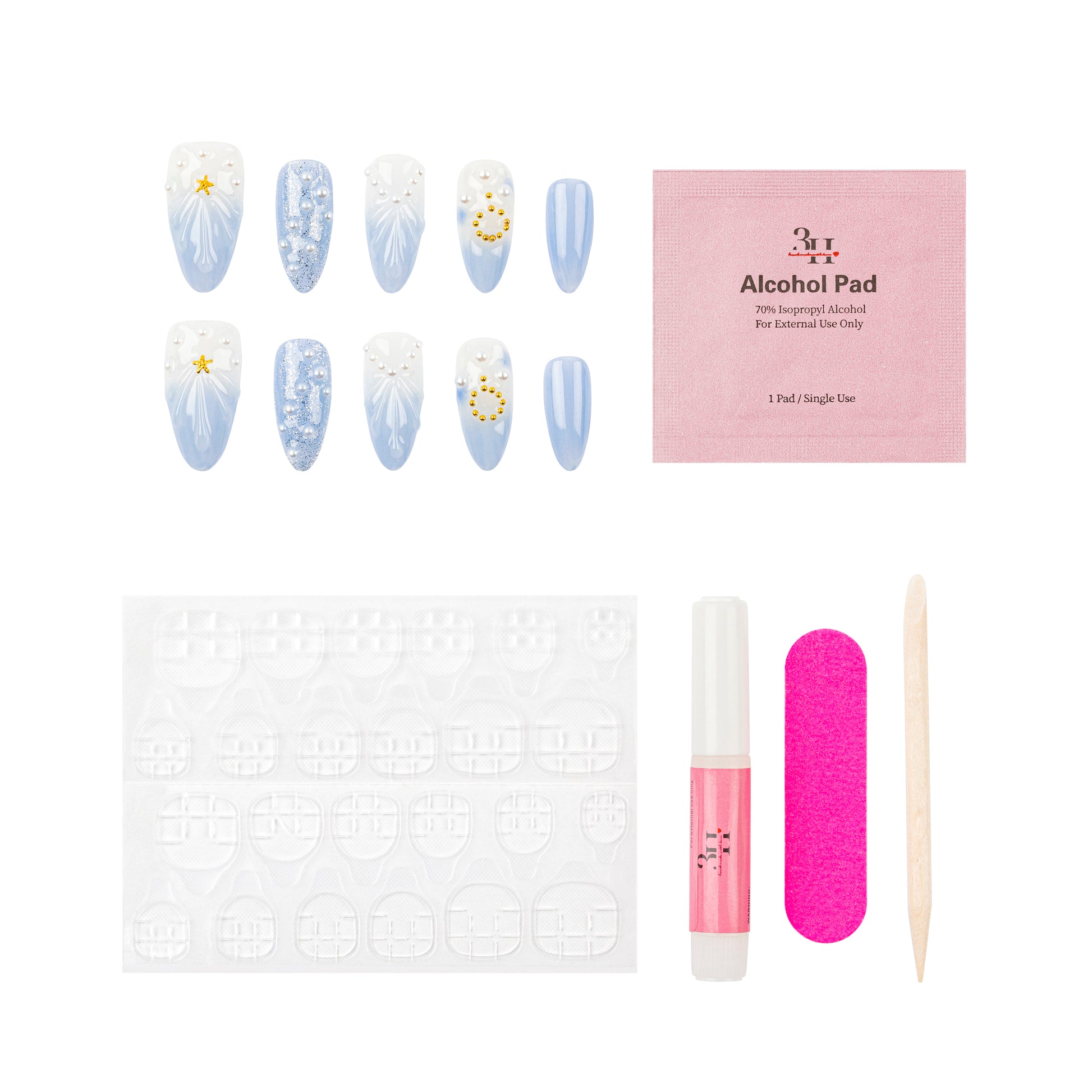 INCLUDES: 10 nails | 1 alcohol pad | 24 adhesive tabs | 1 ml nail glue | 1 cuticle stick | 1 nail file
